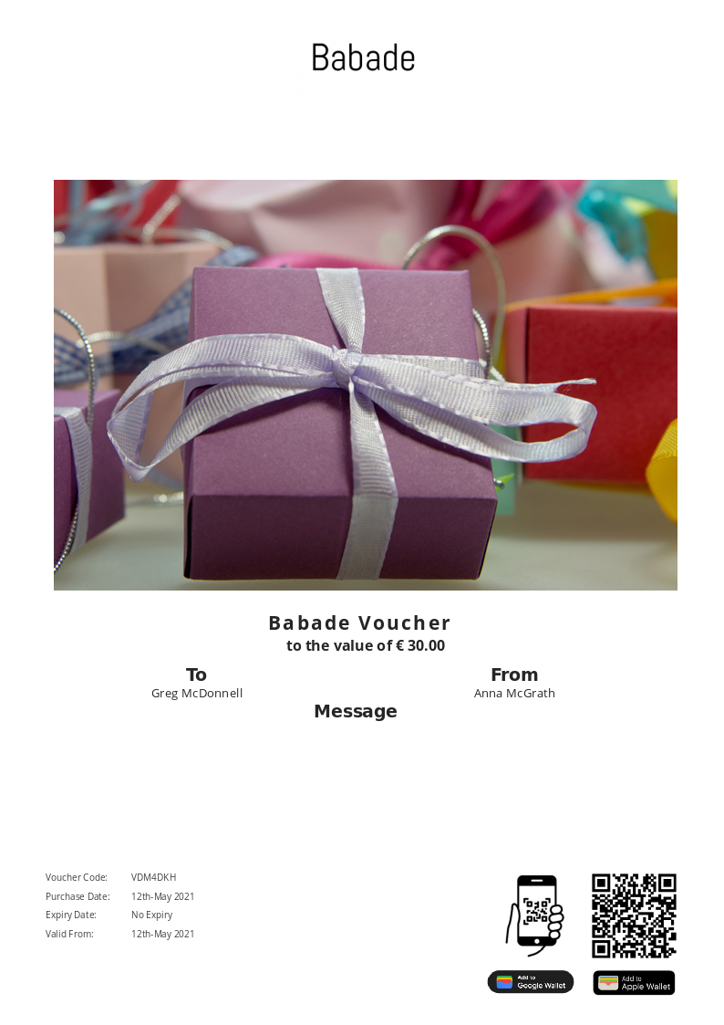 Babade allows you to purchase instantly printable gift vouchers, special offers and tickets using the Voucher Connect platform.